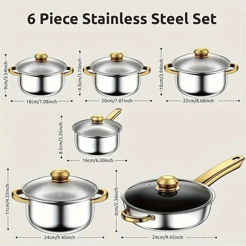 6 Pezzi Set Professionale di Pentole in Acciaio Inossidabile con Coperchi Dorati e Padelle Resistenti al Calore - Compatibile su Induzione/Elettrico/Fornello, Penti Robuste per Tutti i Tipi di Piastre Vetroceramiche o a Gas, Confezione Multi-Dimensionata Ideali per Casa, Ristorante, Campeggio- Compatibile su Induzione/Elettrico/Fornello, Penti Robuste per Tutti i Tipi di Piastre Vetroceramiche o a Gas, Confezione Multi-Dimensionata Ideali per Casa, Ristorante, Campeggio